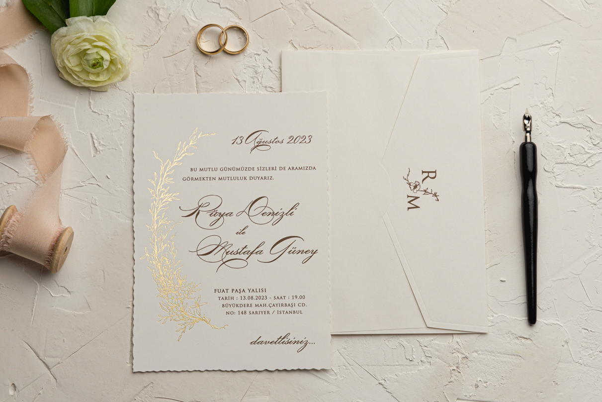 Paperla va pune la dispozitie invitatii de nunta, confectionate dintr-un carton mat fara striatii, destinat textului, ce prezinta un model auriu in partea stanga iar marginile neuniforme confera un plus de eleganta.Invitatia contine plic clasic.Invitatia se personalizeaza cu textul pe care il doriti, corespunzator evenimentului dumneavoastra.