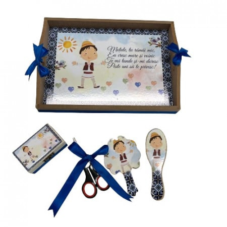 Pe lângă tavita încărcată de simbolism, pachetul include o oglindă care va reflecta chipul fericit al copilului în timpul acestui ritual de inițiere. Oglinda, împodobită cu același tipar de colaj ca și tavita, adaugă un plus de coerență și estetică întregului set.